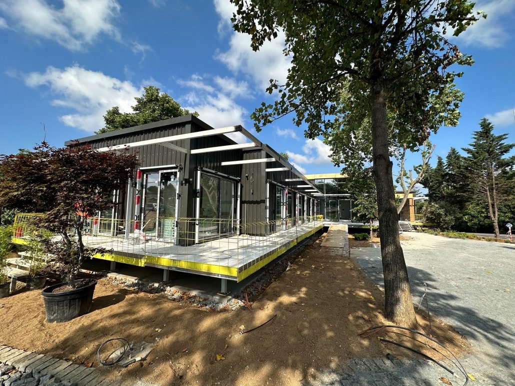Our Karanfilköy Mass Housing Project Sales Office Building reference is one of the best examples of Pramo Prefabrik’s modern and functional sales office solutions for mass housing projects. This structure has been carefully designed to offer home buyers an impressive and professional welcoming experience. Constructed using durable light steel construction, the sales office is earthquake resistant and long-lasting. Equipped with advanced insulation technologies, the structure increases indoor comfort by providing energy savings throughout all four seasons.