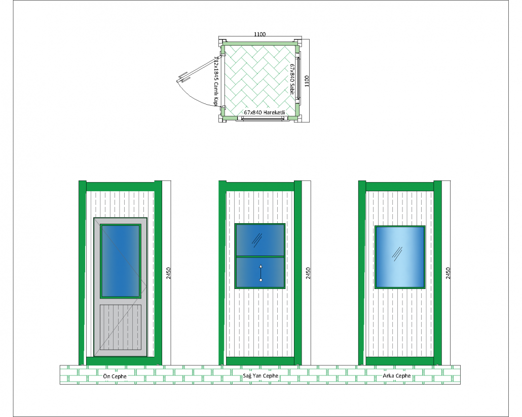 This panel cabin is an ideal solution for use in narrow spaces with its compact and durable design. With its 1100 mm x 1100 mm base dimensions and 2540 mm height, this cabin offers maximum functionality in minimal spaces. The glass door (924×1954 mm) on the front of the cabin provides easy access to the interior and offers a spacious entrance. The movable window (676×840 mm) on the right side facade is designed to provide air flow inside and increase ventilation inside the cabin. There is a fixed window on the rear facade; this window allows natural light to enter and contributes to energy saving.