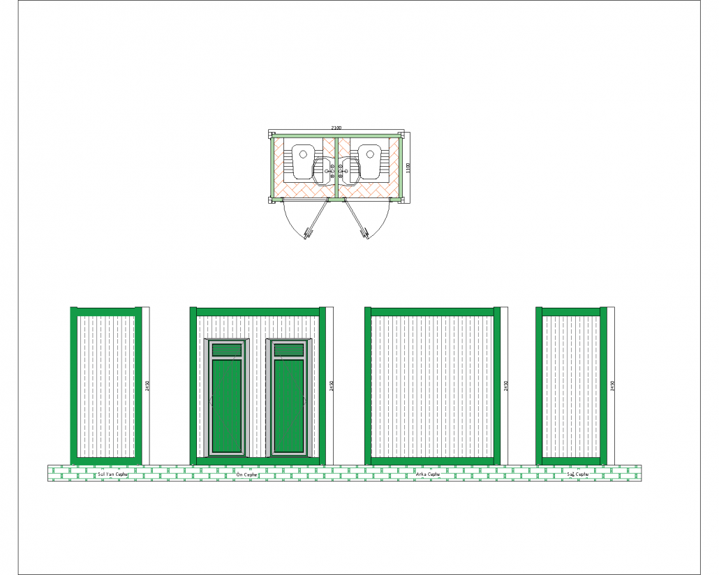 This panel cabin has two separate toilet units and is a practical and durable prefabricated structure solution designed for common use. With a base size of 2100 mm x 1100 mm and a height of 2540 mm, this cabin is an ideal option especially for construction sites, outdoor activities and temporary facilities. The cabin has two separate entrances and each entrance has glass doors. These doors are equipped with small windows on the upper parts that support ventilation.