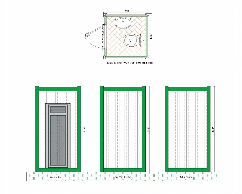 This panel cabin is designed as a compact solution that combines a WC and shower area. With dimensions of 1300 mm x 1300 mm and a height of 2540 mm, this cabin is ideal for construction sites, outdoor events and temporary facilities. Its interior arrangement includes a sink, toilet and shower area, and is equipped to meet the basic hygiene needs of users.