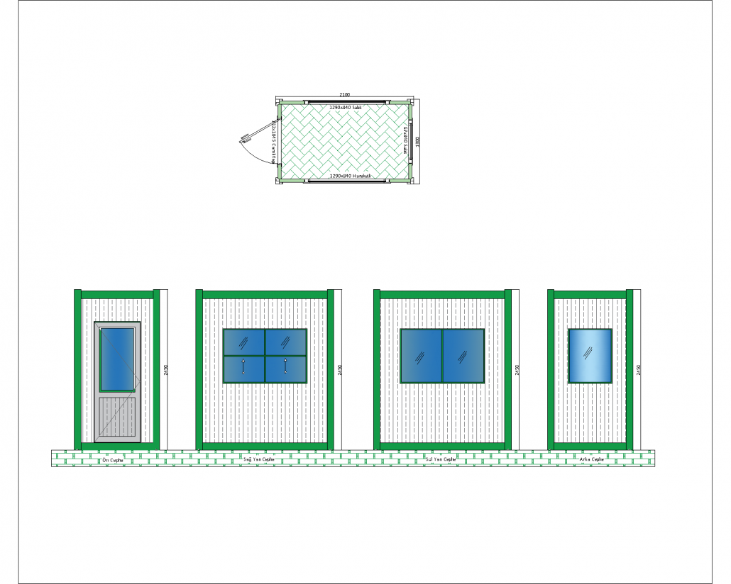 This panel cabin offers a modern and useful building solution with its large glass details and durable structure. With its 2100 mm x 2100 mm base dimensions and 2540 mm height, this cabin is ideal especially for construction sites, security points and temporary office areas. The interior is illuminated with natural light thanks to its large windows and provides a spacious environment.
