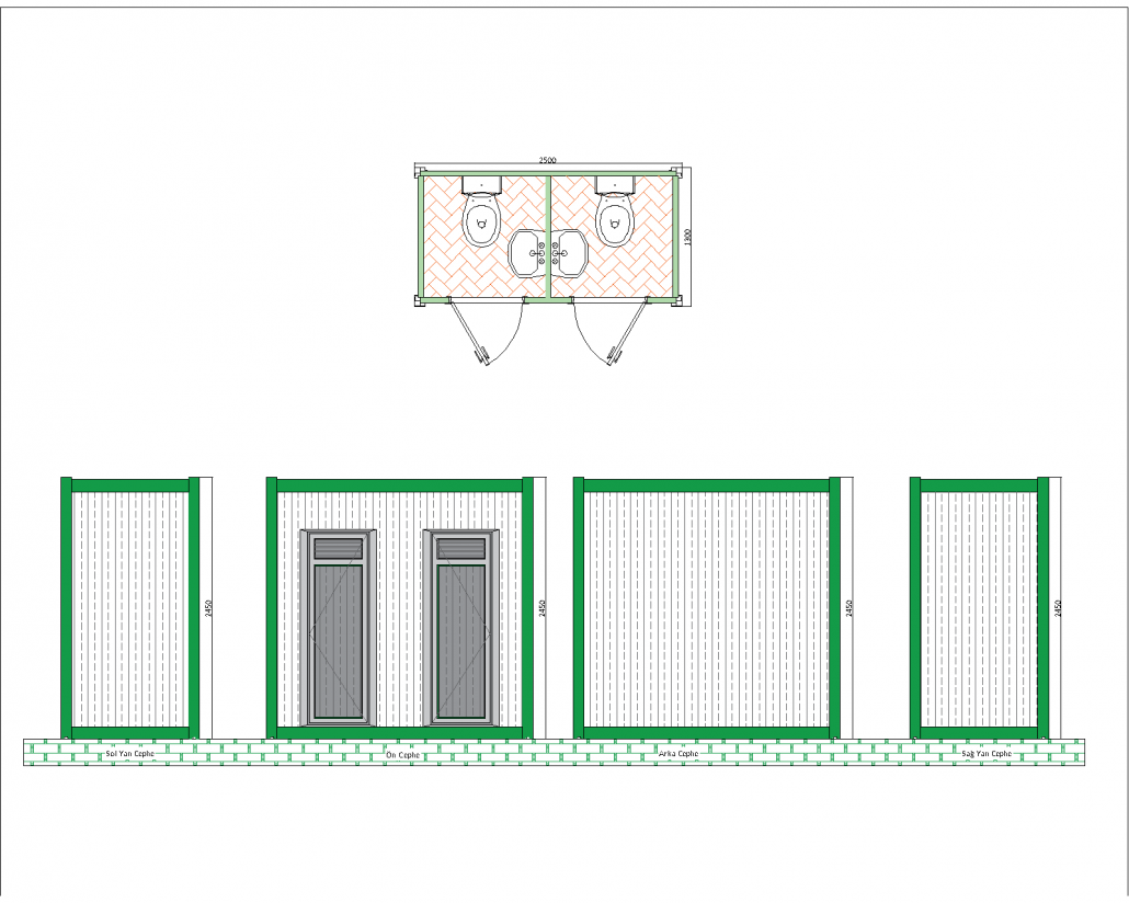 This panel cabin offers a functional solution with two independent WC units. With a base size of 2500 mm x 1300 mm and a height of 2540 mm, this cabin is ideal for areas requiring intensive use. It is designed for use in environments such as construction sites, outdoor events or temporary facilities. Each WC unit has an independent entrance door, which increases user privacy and provides ease of use.
