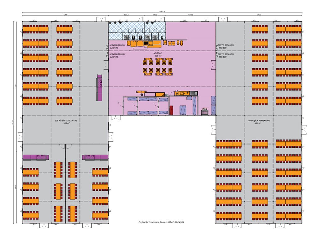 This visual shows the details of a 1380 m² prefabricated dining hall building designed for large-scale projects. Providing a large dining area with a capacity of 724 people, this building prioritizes functionality with two main dining halls and a kitchen section. While there are dining halls with a seating capacity of 408 and 316 people on the left and right sections, there are service areas and a 120 m² kitchen in the middle.