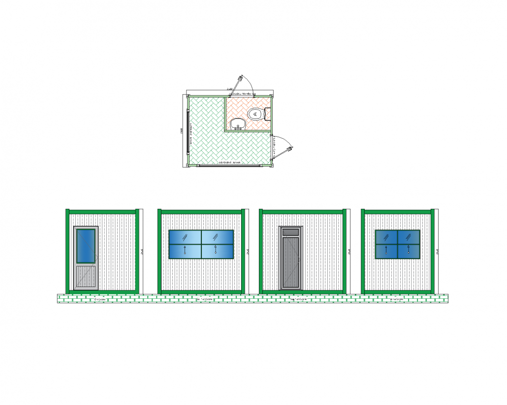 This panel cabin is designed to meet various needs with its functional and durable structure. Thanks to its glass door on its wide front facade and windows on the side facades, it provides a comfortable work or rest area by filling the interior with natural light. Its interior design is designed to meet basic needs such as sink and toilet. Thus, it can be used both as a work area and as a toilet cabin.