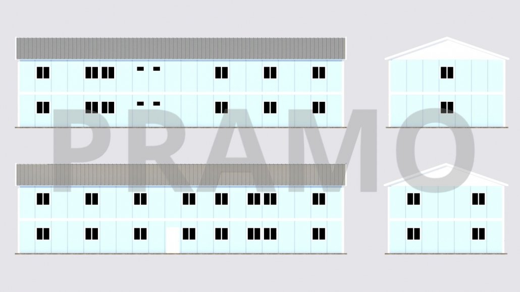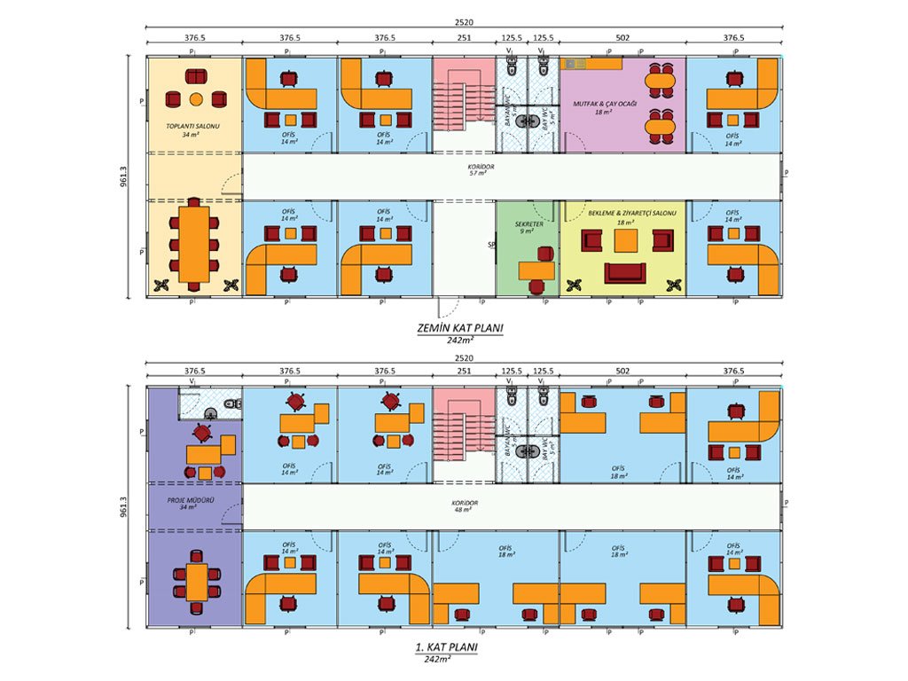 On the first floor, there is a 34 m² project manager room and additional office areas. This floor makes offices accessible on both sides with its wide corridor. The 14 m² and 18 m² offices offer suitable areas for different departments or functional needs. With its fast-installable and flexible structure, this office building is an ideal solution for temporary or permanent office needs. The ergonomic and modern layout it provides adapts to professional work environments.